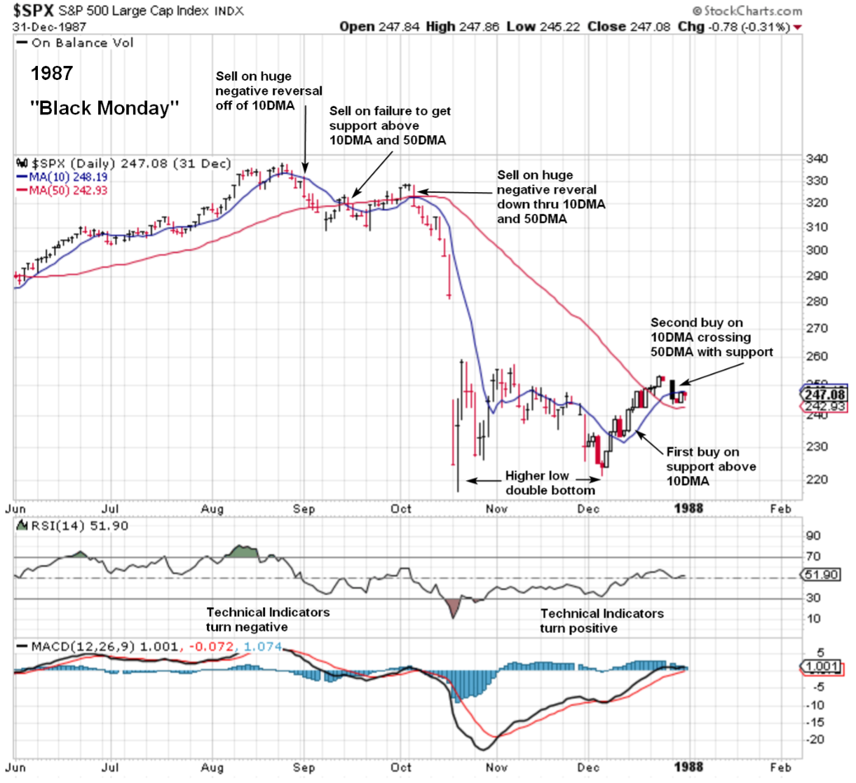 The reality is that the Market gave 3 clear sell signals well before the 19 October crash. On September 1st, the market put in a huge negative reversal day after 3 consecutive days below its 10DMA (Day Moving Average) line. This was the first sell signal.