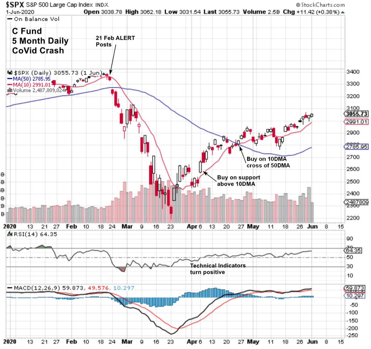 The CoVid-19 Pandemic crash of 2020 was the most recent example of the value of the GrowMyTSP methodology. The Allocation ALERT issued on 21 February 2020 got our subscribers out of the TSP stock funds based on the analysis described back in the Risk section of this guide. The very next trading day, the market began its collapse. Much as we would like to claim prescience and a “Crystal Ball”, nothing could be further from the truth. Our reallocation decision on 21 February 2020 was based on sound technical analysis of price action, not on anticipated issues related to Covid. We DO NOT have a crystal ball…